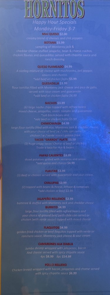 Cafe Hornitos is a Tex-Mex restaurant located in Austin, TX, offering a variety of dishes for breakfast, lunch, and dinner. With a casual atmosphere and a full bar, it's perfect for both groups and families. The menu features antojitos like queso compuesto and jalapeƱo rellenos, as well as taco plates with options like brisket tacos and fish tacos. Their soups and salads, such as the taco salad and chicken salad, are fresh and flavorful. Customers rave about the friendly staff and great service, making it a neighborhood favorite. The cozy ambiance and tasty margaritas enhance the dining experience. Overall, Cafe Hornitos is a hidden gem with delicious Mexican cuisine that keeps customers coming back for more.