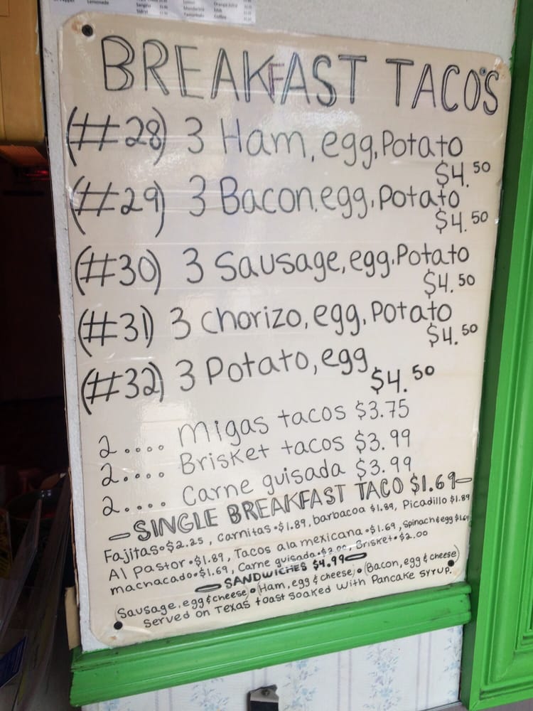 3 breakfast tacos with a selection of ham, bacon, sausage, chorizo, or just potato with egg. Mix and match options available.